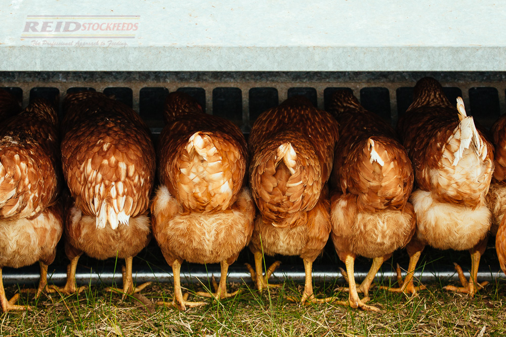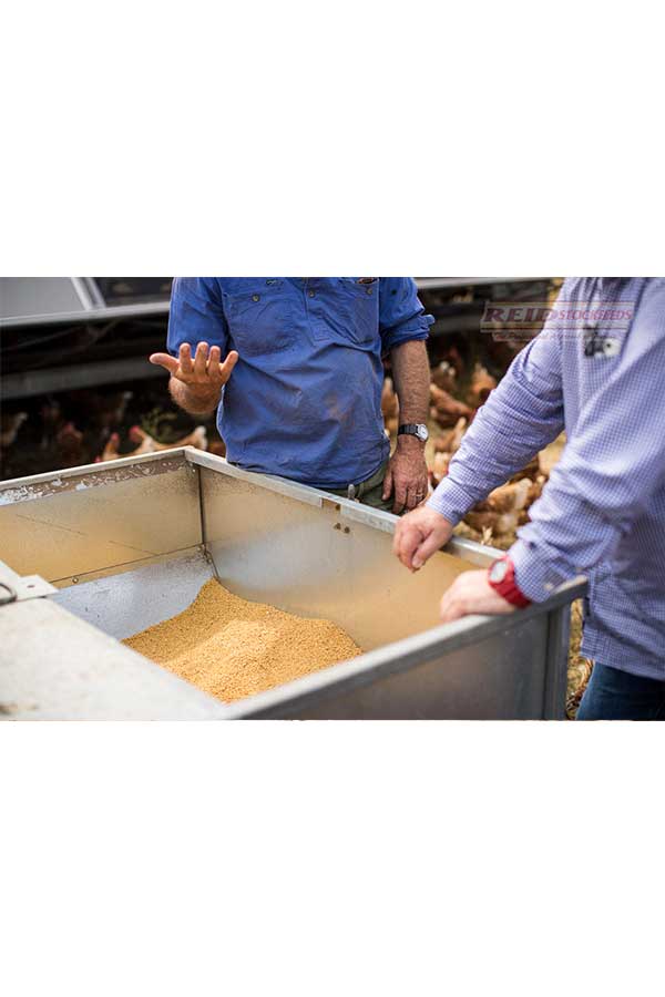 • In situations where the hens have access to pasture, ideally, the hens should be consuming at least 100g per hen per day of Reid Ranger. If feed intake is less than this due to intake of grass or other factors, please speak with your Reid Stockfeeds representative for guidance on supply of another more suitable diet.
