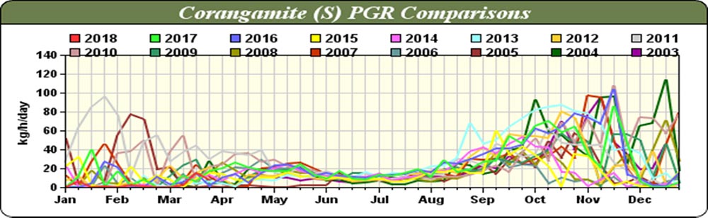 The graph below is an image downloaded from “pastures from space”. The image tracks 15 years of pasture growth it clearly shows that growth rates start to improve in August. The extra pasture growth leads the cows ration to change from largely high fibre, moderate protein hay and silage to high protein and low fibre pastures.